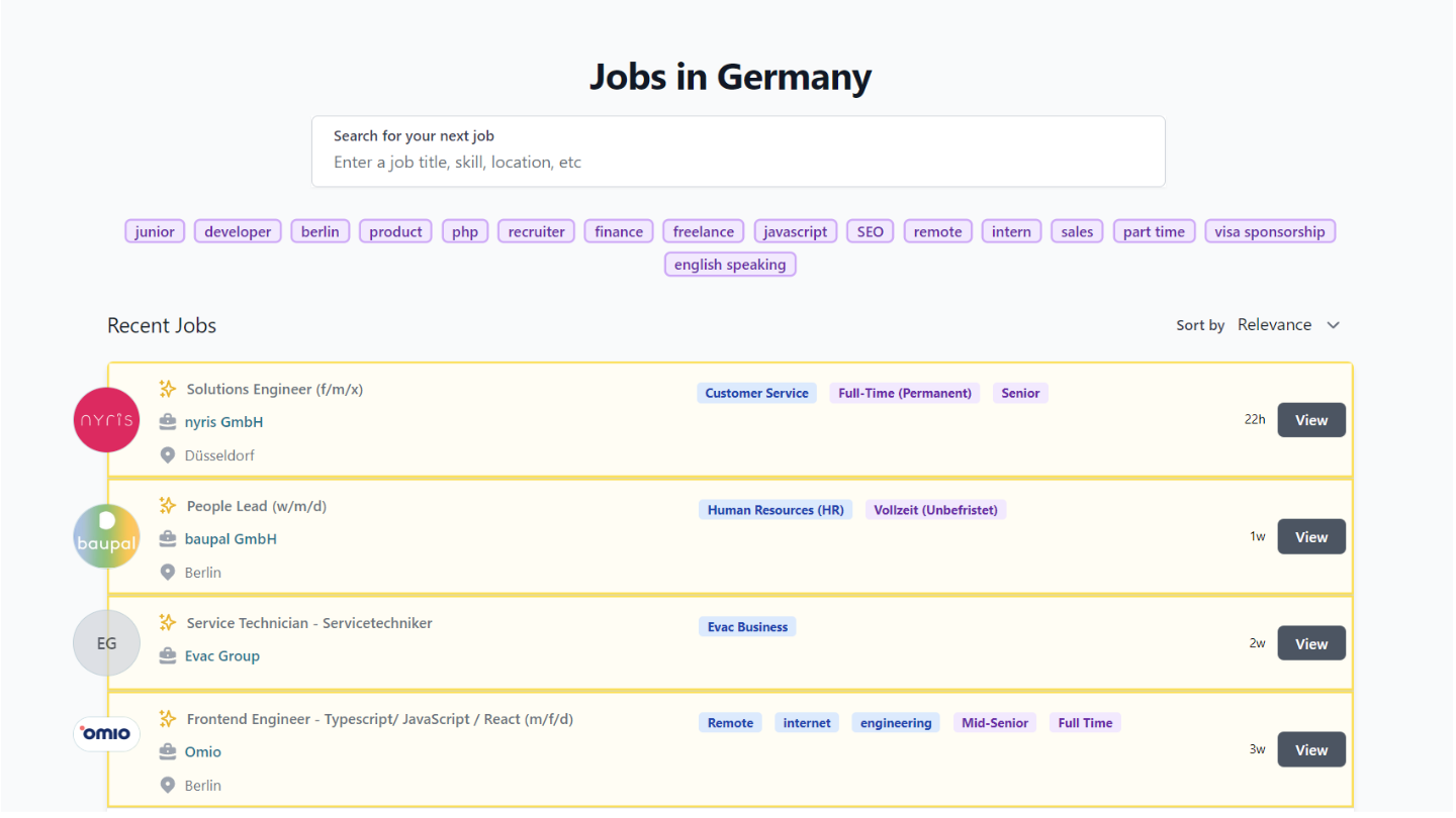 Arbeitnow helps candidates find jobs in Germany with support for visa sponsorship, english speaking jobs and remote jobs.
