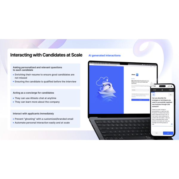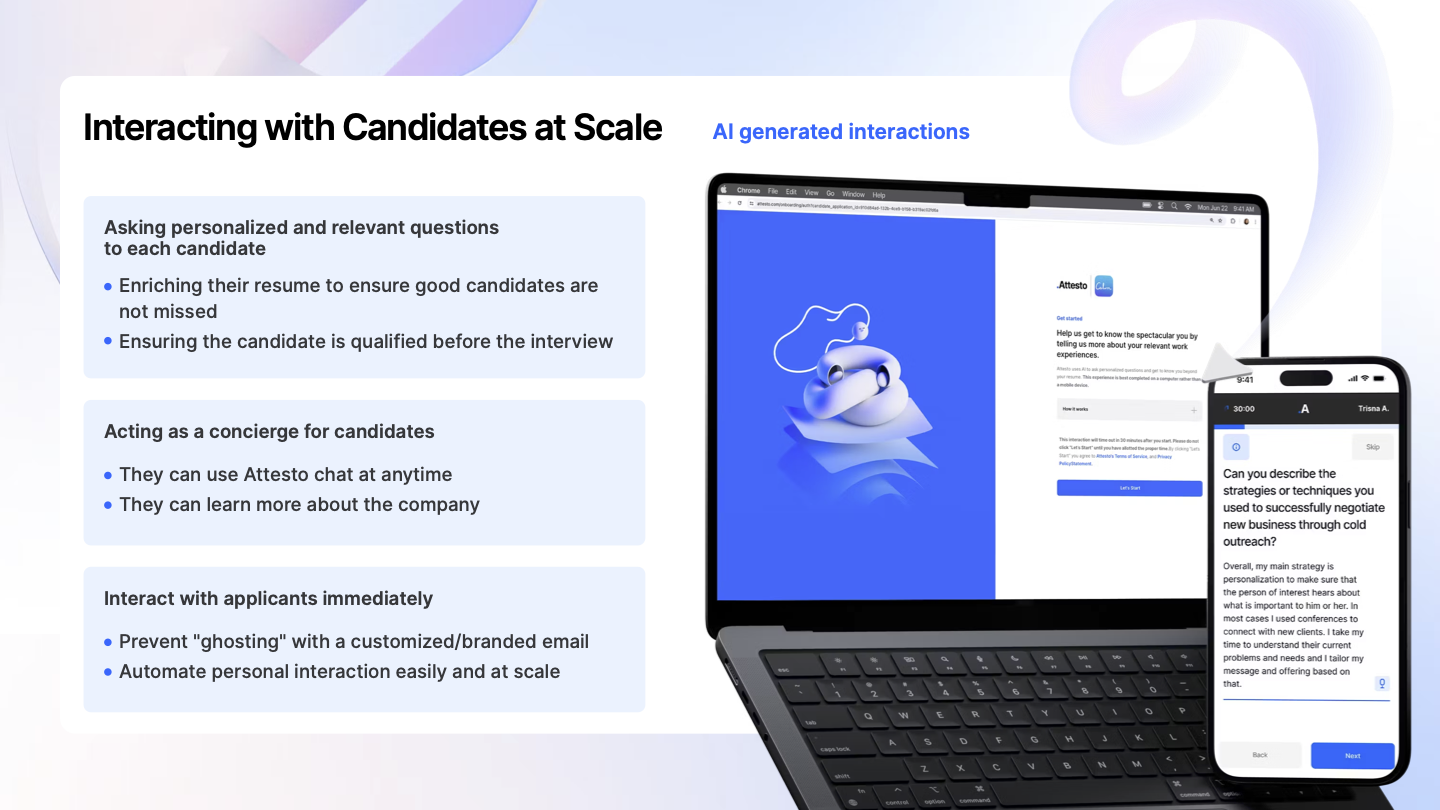 Attesto delivers personalized interactions that allow candidates to learn about the company and answer personalized questions about their past experiences.Ā