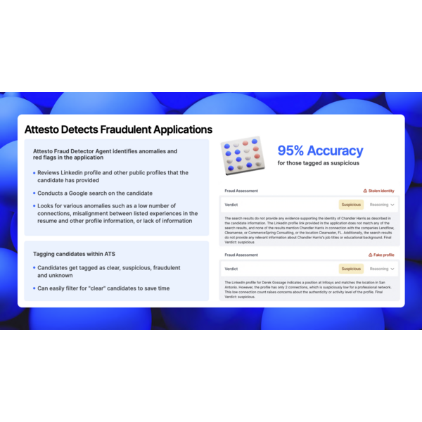 Attestoās agents assess both fit and fraud using application data, public web signals and personalized candidate interactions. Through the Attesto Trust Layerāan integrated system of AI agents, fraud-detection models and proprietary dataācompanies can reliably detect fake or misrepresented candidates without sacrificing the candidate experience.