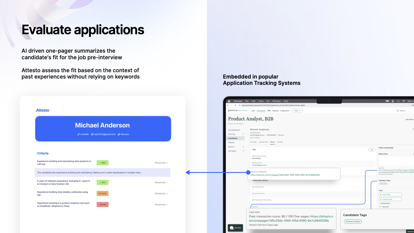 Attesto evaluates candidates based on past experiences and earned qualifications. The assessment criteria are highly flexible for teams, and the Attesto agent looks for evidence in the candidateās application, public profiles and Attesto's personalized interaction with the candidate. Ā