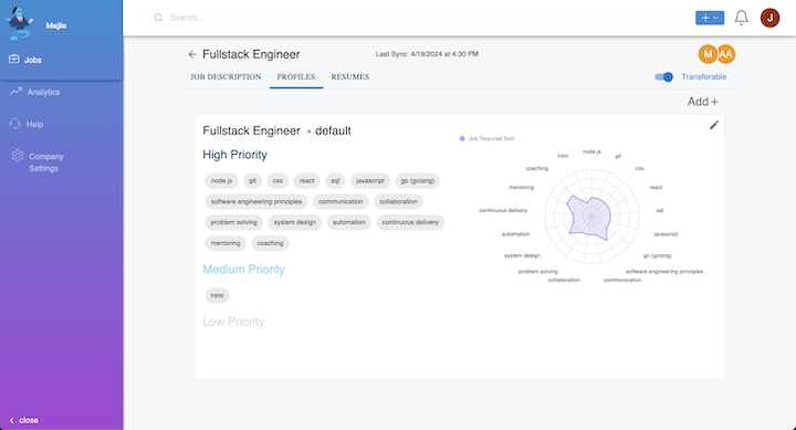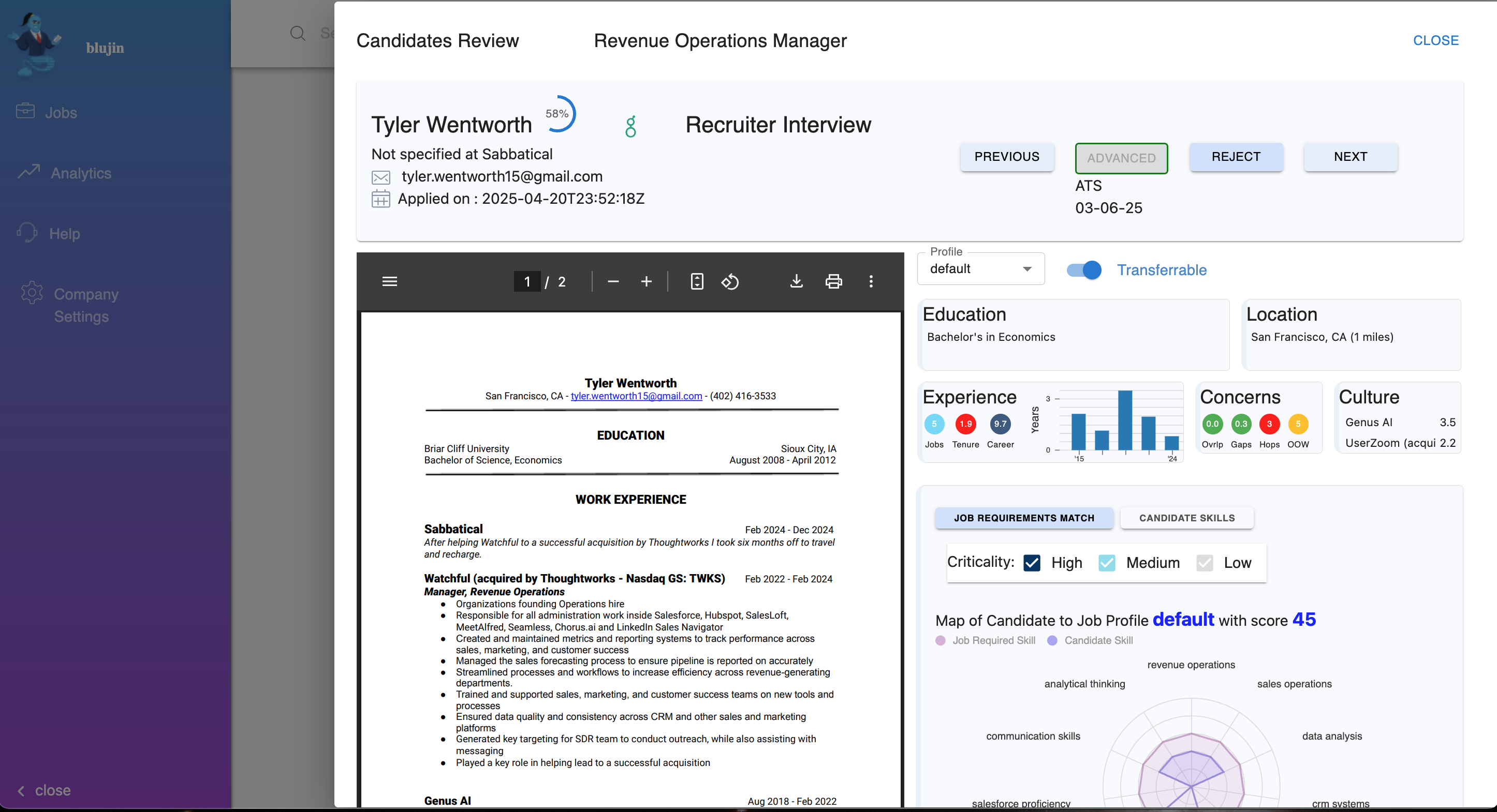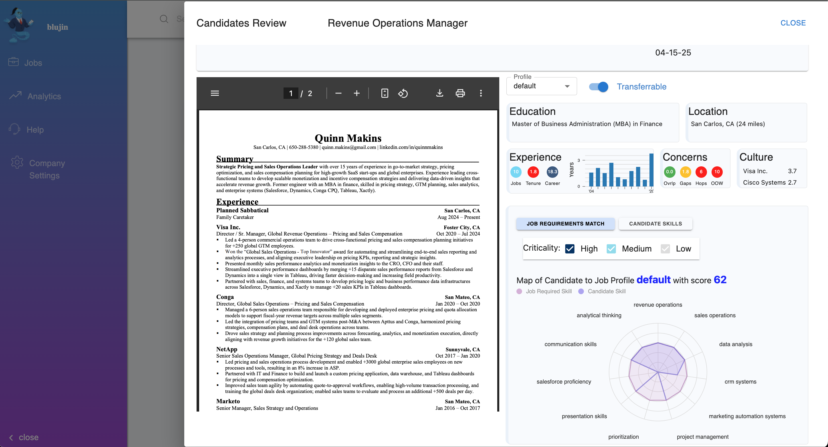 Blujin intelligently quantifies the depth of experience for every skill—explicit or implied—within a resume, and carefully scores them against the specific experience levels required by the job, ensuring a precise matching and ranking between candidate capability and role expectations.