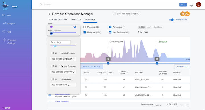 Blujin Resume Explorer offers sophisticated yet intuitive temporal filters, enabling you to quickly narrow the applicant pool based on industry tenure, past or current roles and employers, and proximity to the job location—so you can efficiently eliminate candidates who don’t meet key role-specific criteria.