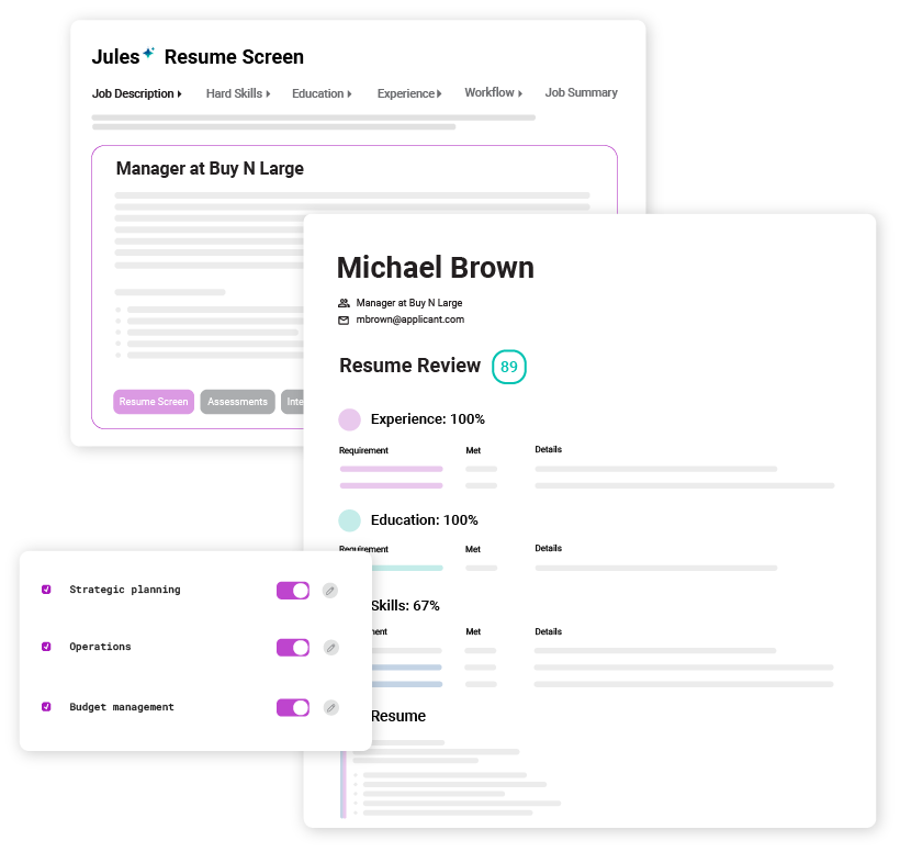 Cut out the resume chaos and identify your top candidates, instantly. Simply paste in your job description - or have Jules AI Copilot create one for you - and watch as critical skills are identified, and ranked results are delivered in seconds. Our transparent AI’s visual reports show the methodology behind each candidate’s scores. Make confident hiring decisions without complex setup or manual configuration.