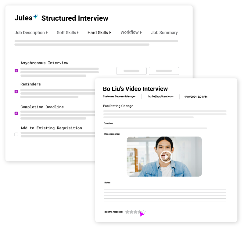 Deliver objective, effective interviews without all the planning. Jules, AI Copilot, instantly creates custom structured interview plans based on your job description, delivering a critical review of required soft and hard skills so you can interview with confidence. No time to interview live? Jules can also interview for you, having candidates record their answers to each question for you to review on your schedule, saving hours of time.