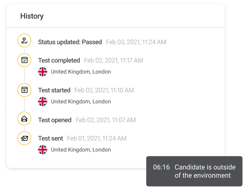 Get alerted to plagiarism and suspicious behavior Ensure your candidate’s results are a true reflection of their skills with our built-in safeguards. Randomize questions so candidates can’t share test details Use code playback to see how candidates coded and when they pasted code (paste can be disabled) Get alerts when abnormal candidate performance or plagiarism are detected Image Caption: