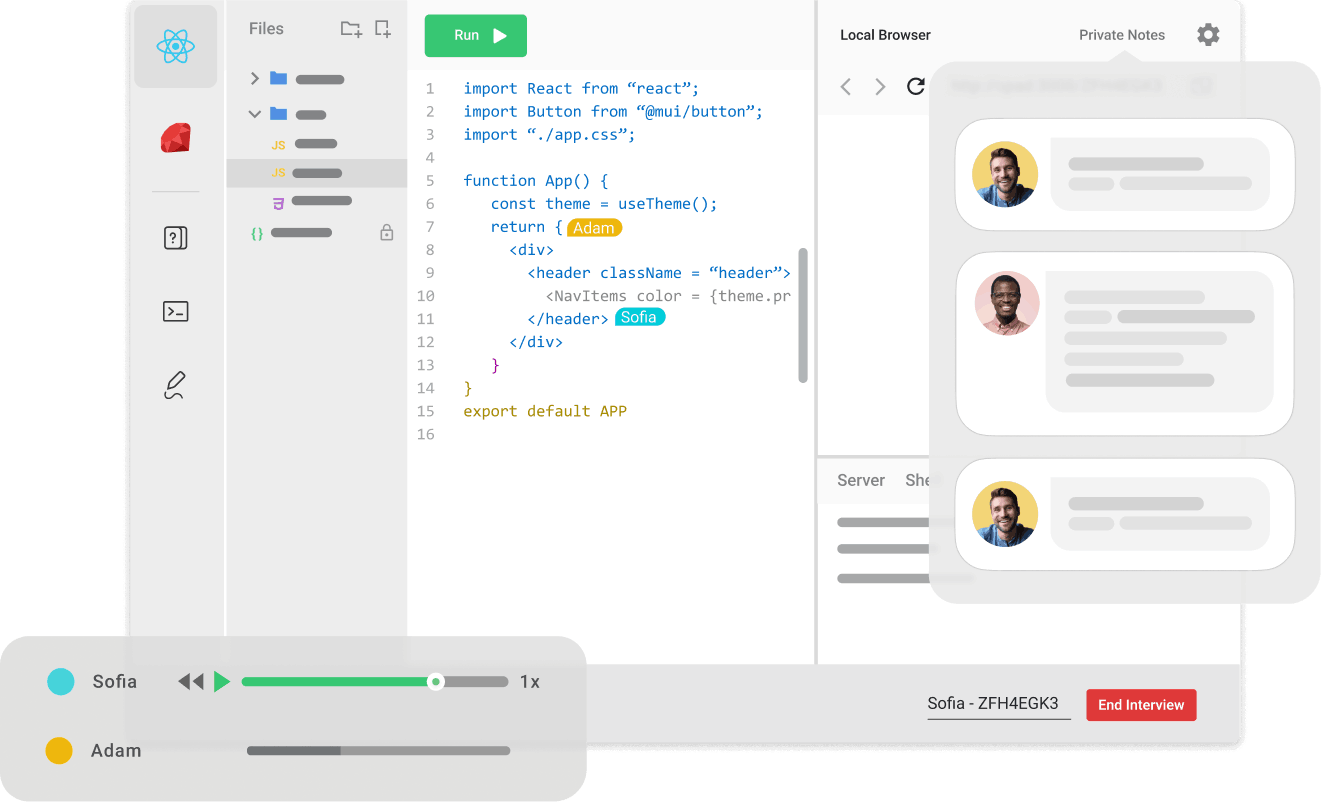 Interview in the most popular front-end and back-end frameworks. Find the right hire for your front-end positions and run realistic, customizable interviews in
