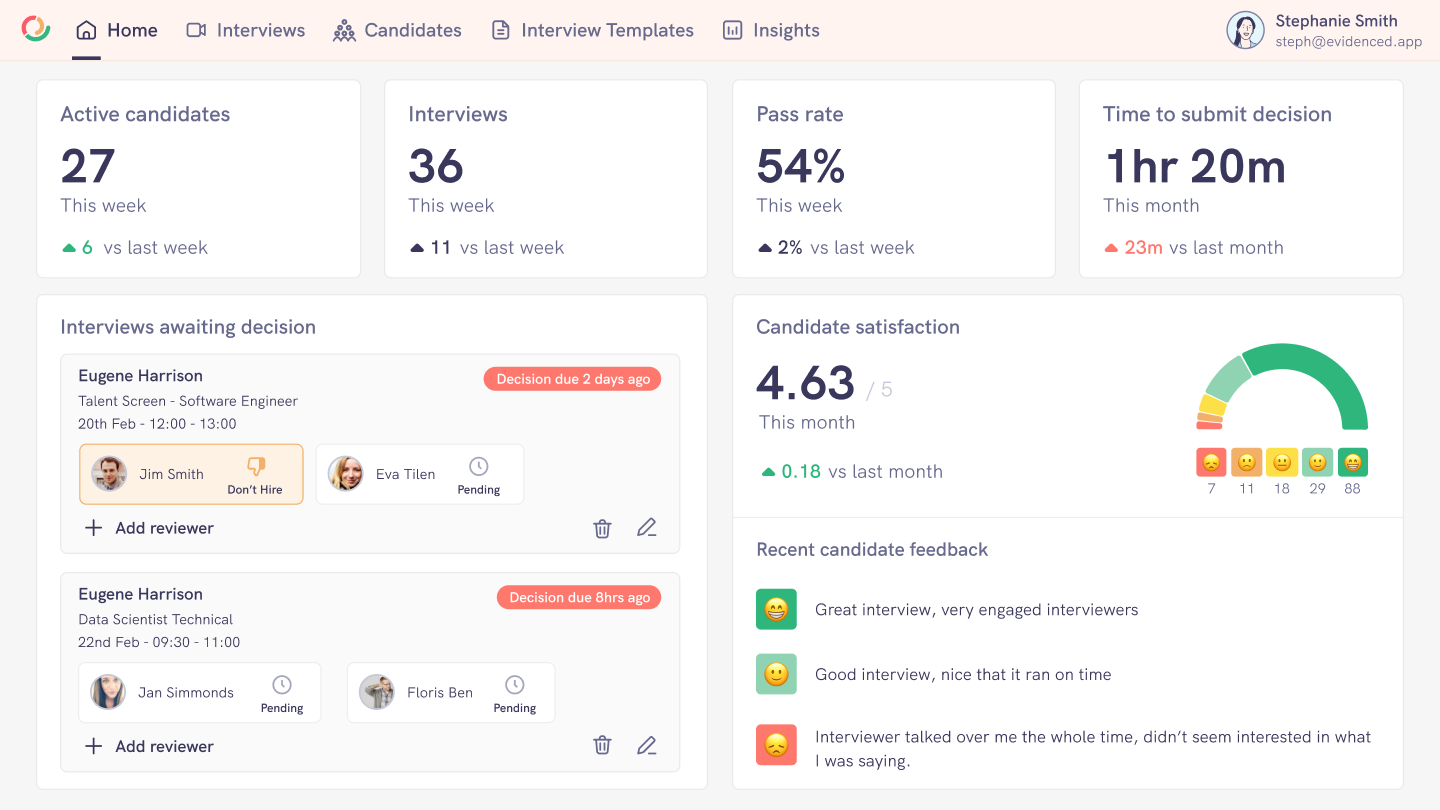 Evidenced is an all-in-one interview experience with video calling, question templates, live timing and quick access bookmarks.
