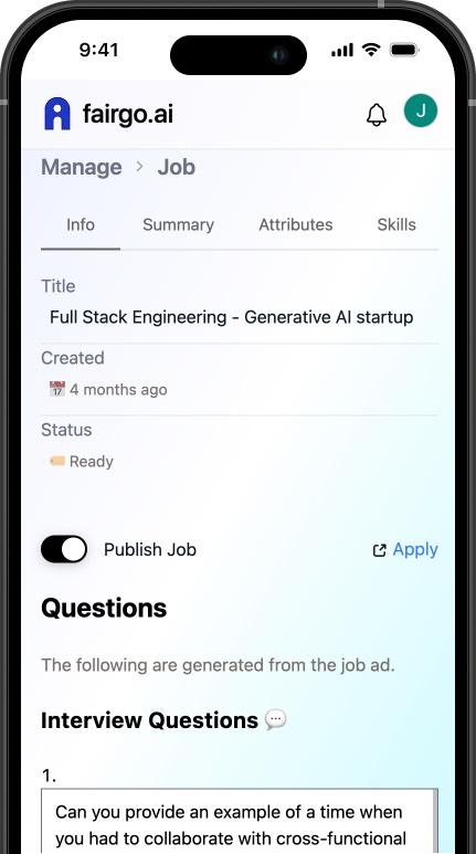 Use the Fairgo.ai integration to connect with Greenhouse to fetch jobs and candidate applications. Jobs are used to automatically create interview questions from the posted content. Candidate resumes are evaluated against the job requirements.