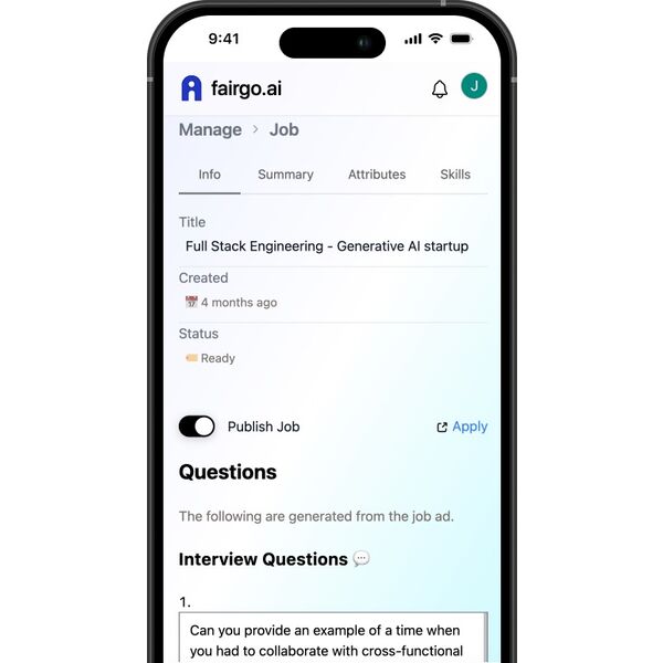 Use the Fairgo.ai integration to connect with Greenhouse to fetch jobs and candidate applications. Jobs are used to automatically create interview questions from the posted content. Candidate resumes are evaluated against the job requirements.