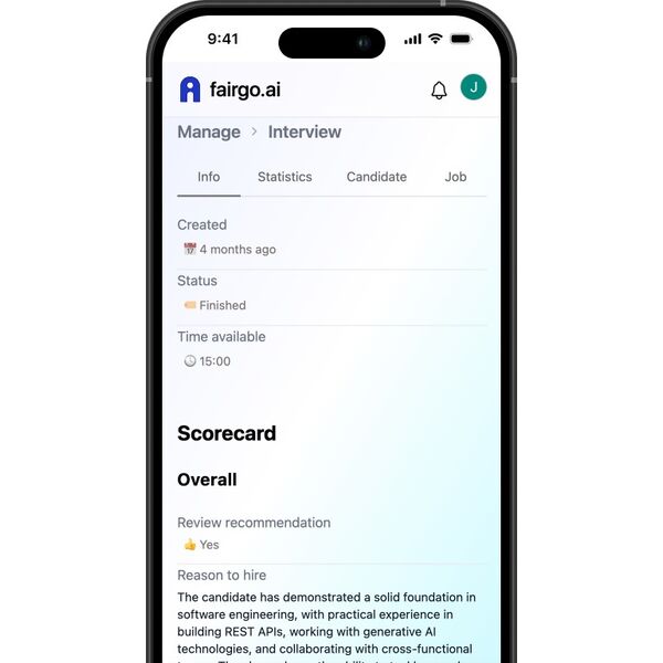 When an assessment integration is set up, hiring managers send a test to a candidate. Fairgo will invite the candidates to a live video interview, where our AI will ask four questions relevant to the role. On completion the interview transcript will be used to evaluate the candidate for the role, and a score along with a deep link to Fairgo.ai will be sent back to Greenhouse.