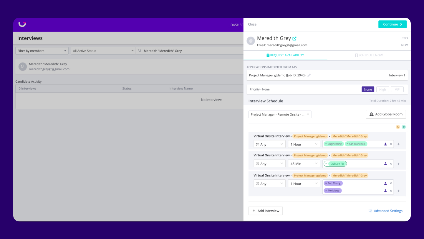 Coordinate single-day, multi-day, multi-panel and Superday interviews from one intuitive dashboard. GoodTime’s AI agents evaluate time zones, skills, interview requirements and calendar histories — finding ideal options instantly, even when the “obvious” schedule doesn’t exist. Schedule candidates individually or in bulk and automate confirmation to move faster than basic scheduling tools.