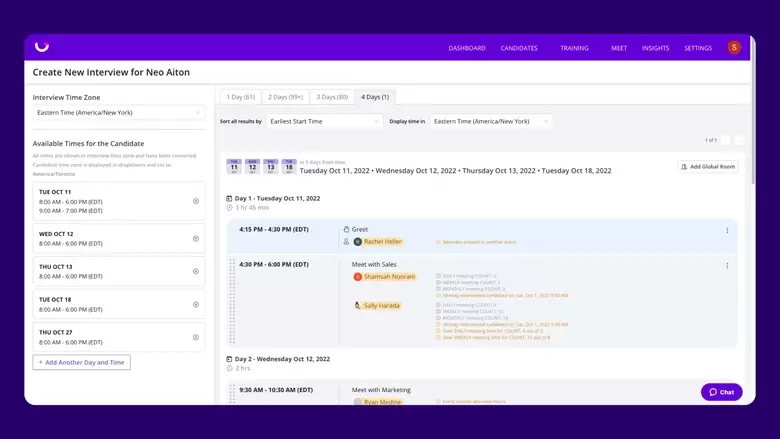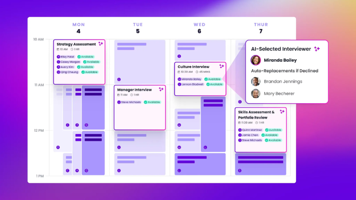 Use AI to select the best interviewer for each interview based on skill set, scheduling history and preferences. Intelligently balance interview loads to ensure that each interviewer stays fresh. Instantly replace interviewers who decline with the next-best choice, so your process stays on track.