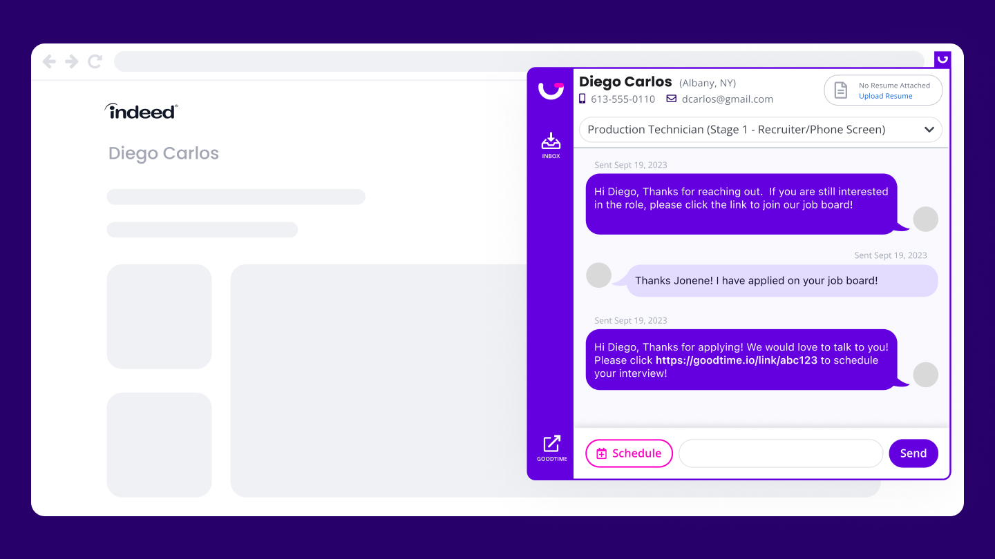 Reach candidates where they respond fastest. Send messages individually or in bulk, and let candidates schedule directly from SMS, WhatsApp or email. Maintain a personal touch with dynamic templates and local numbers. Send texts directly from Greenhouse or Indeed without switching tabs.