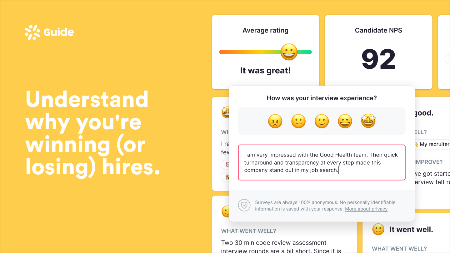 Gather candid, unbiased candidate feedback after every interview with Guide's Escrowed™️ candidate surveys.