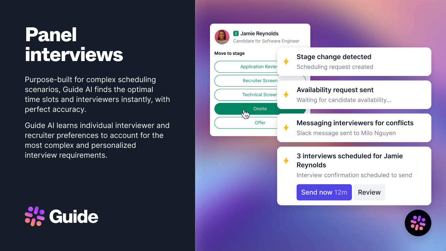 Guide AI automates even the most complex multi-interviewer scheduling scenarios. By learning individual interviewer preferences, availability patterns, and stage-based workflows, Guide instantly finds the optimal time slots—resolving conflicts and sending confirmations automatically.