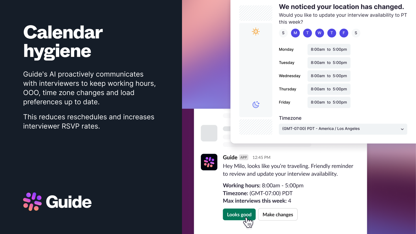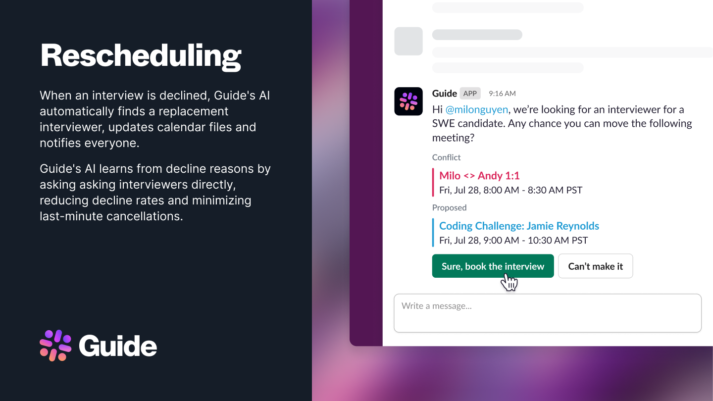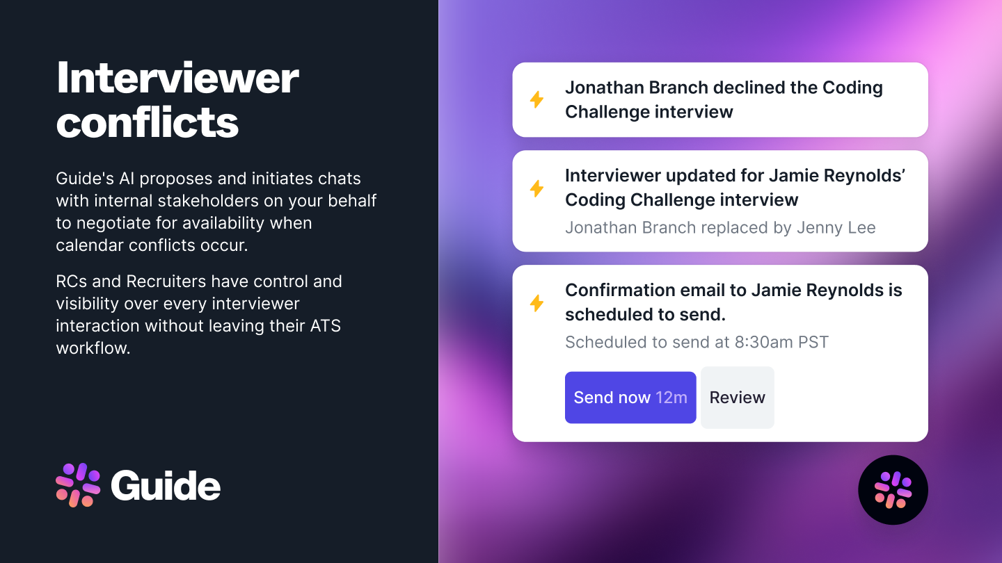 When calendar conflicts arise, Guide AI automatically coordinates with interviewers via Slack or email to find alternatives and keep schedules intact. Recruiters and RCs stay in control with full visibility into every adjustment—no context switching or manual follow-up required.