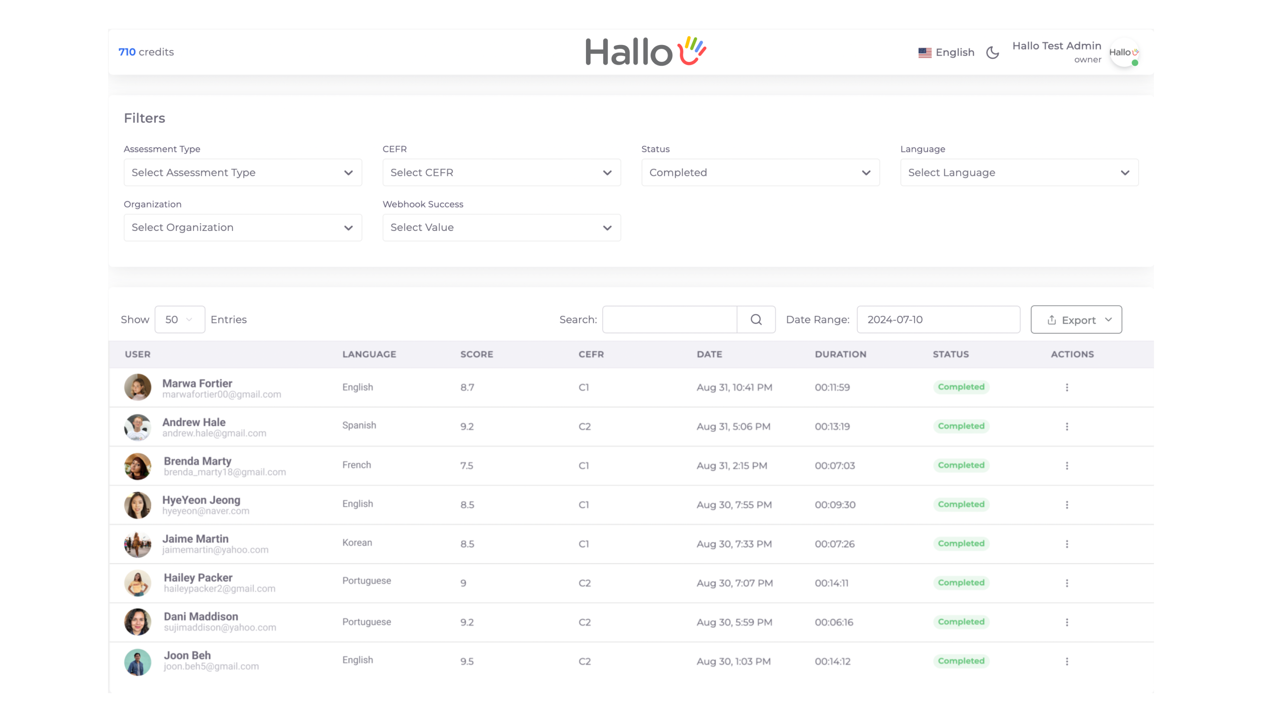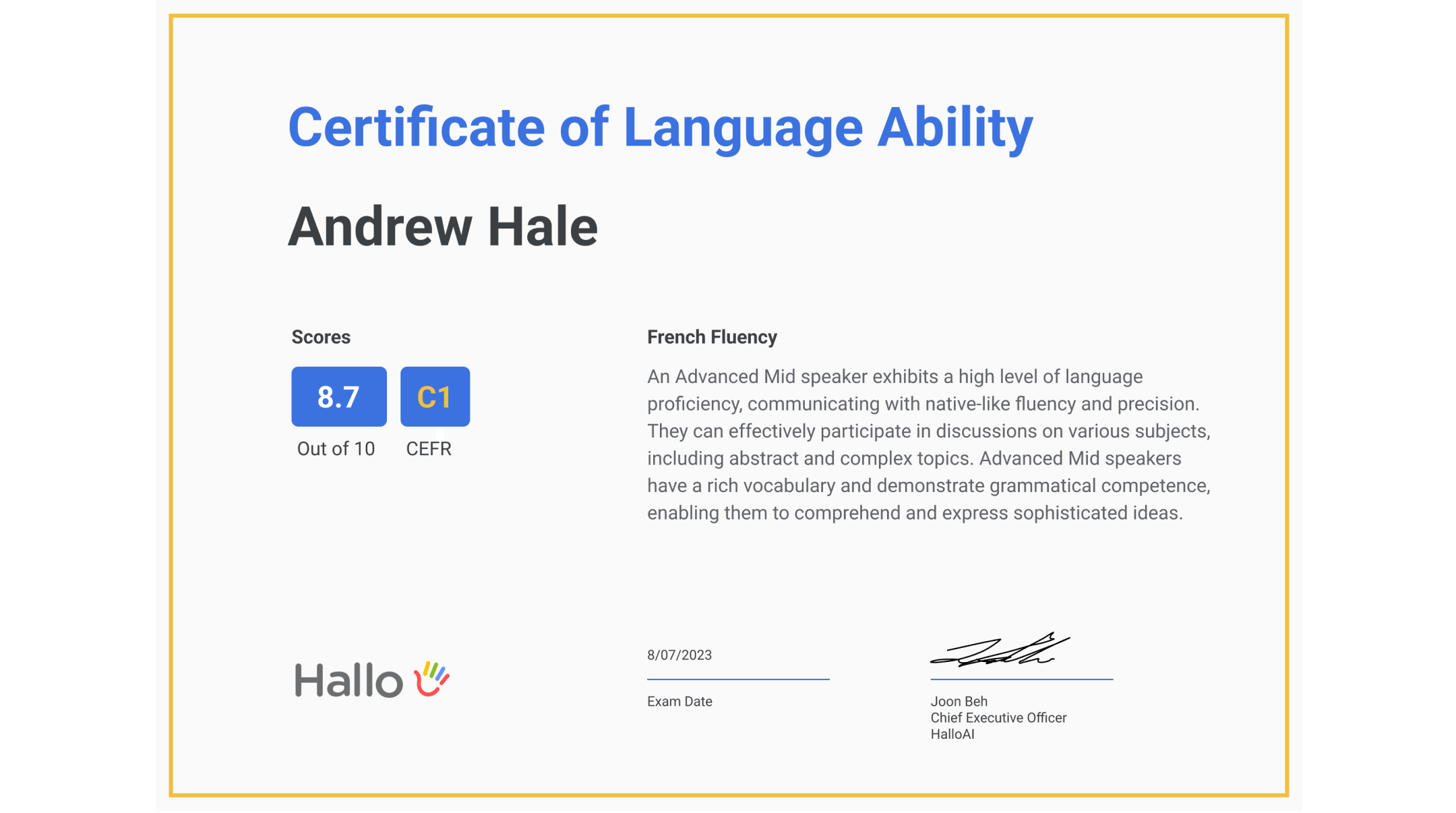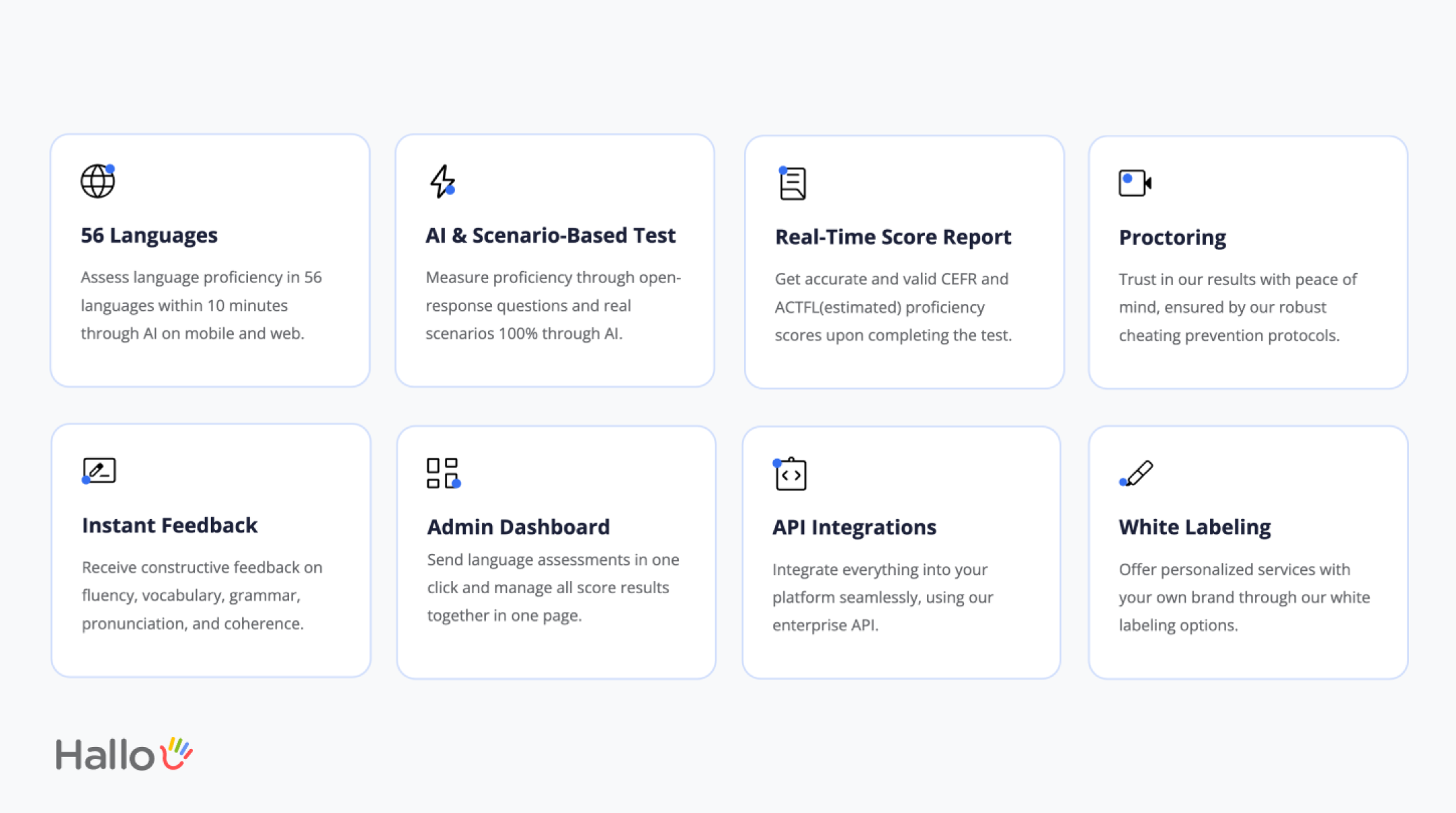 Hallo is an AI-powered language assessment platform that evaluates the proficiency levels of your applicants according to CEFR standards.
