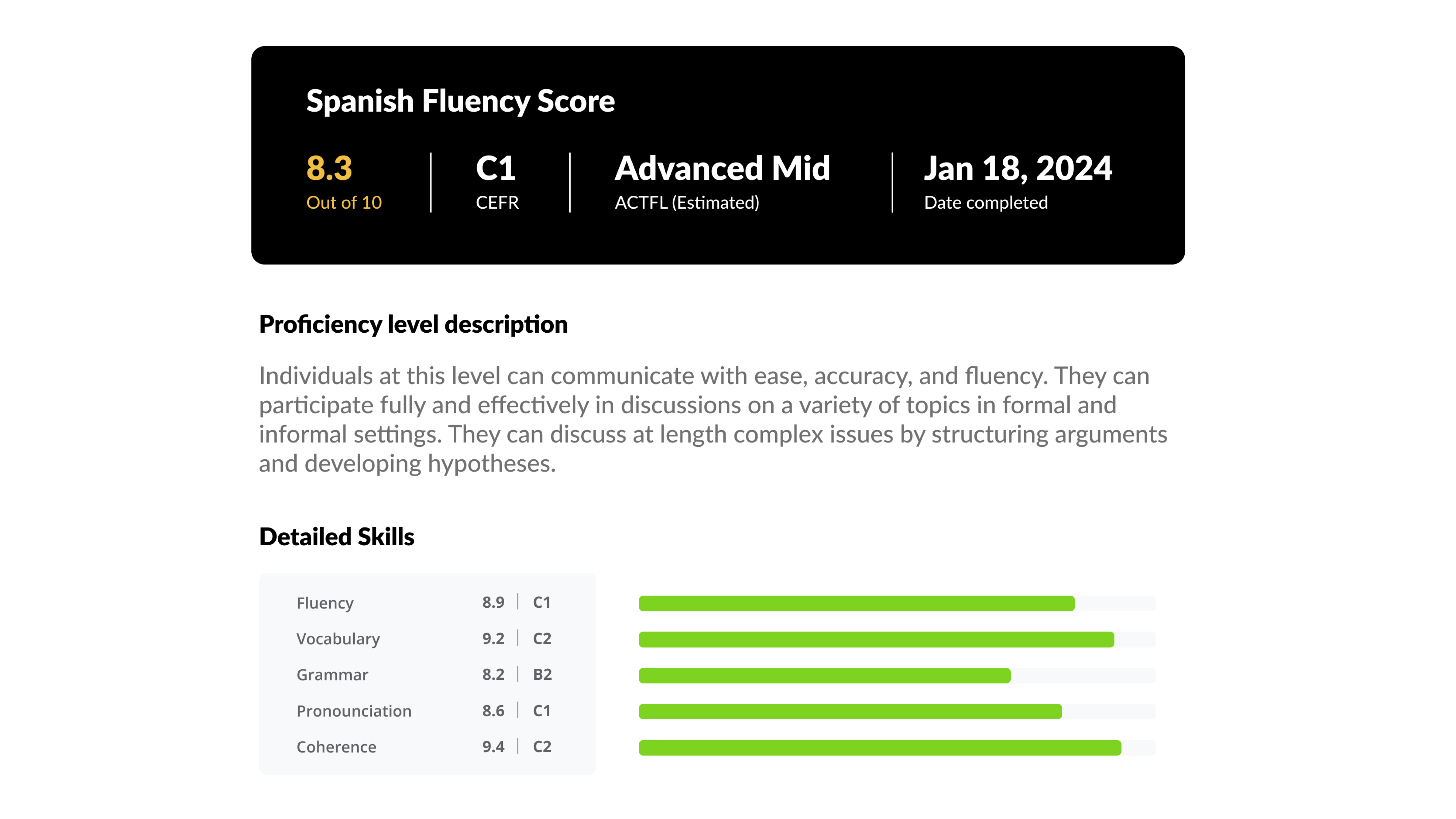 Unlike human-rated proficiency interviews, Hallo’s AI-driven assessment process eliminates human error and bias, achieving a remarkable 95% accuracy rate and helping organizations significantly save time and budget.