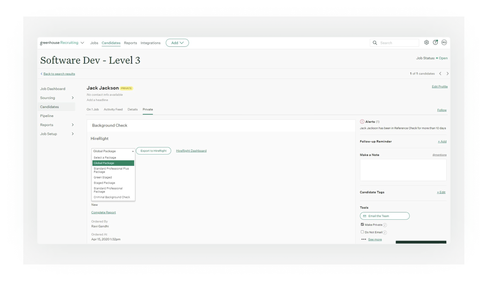 HireRight offers an integrated solution that enables users to order background screening services seamlessly and in real time directly within Greenhouse Recruiting.