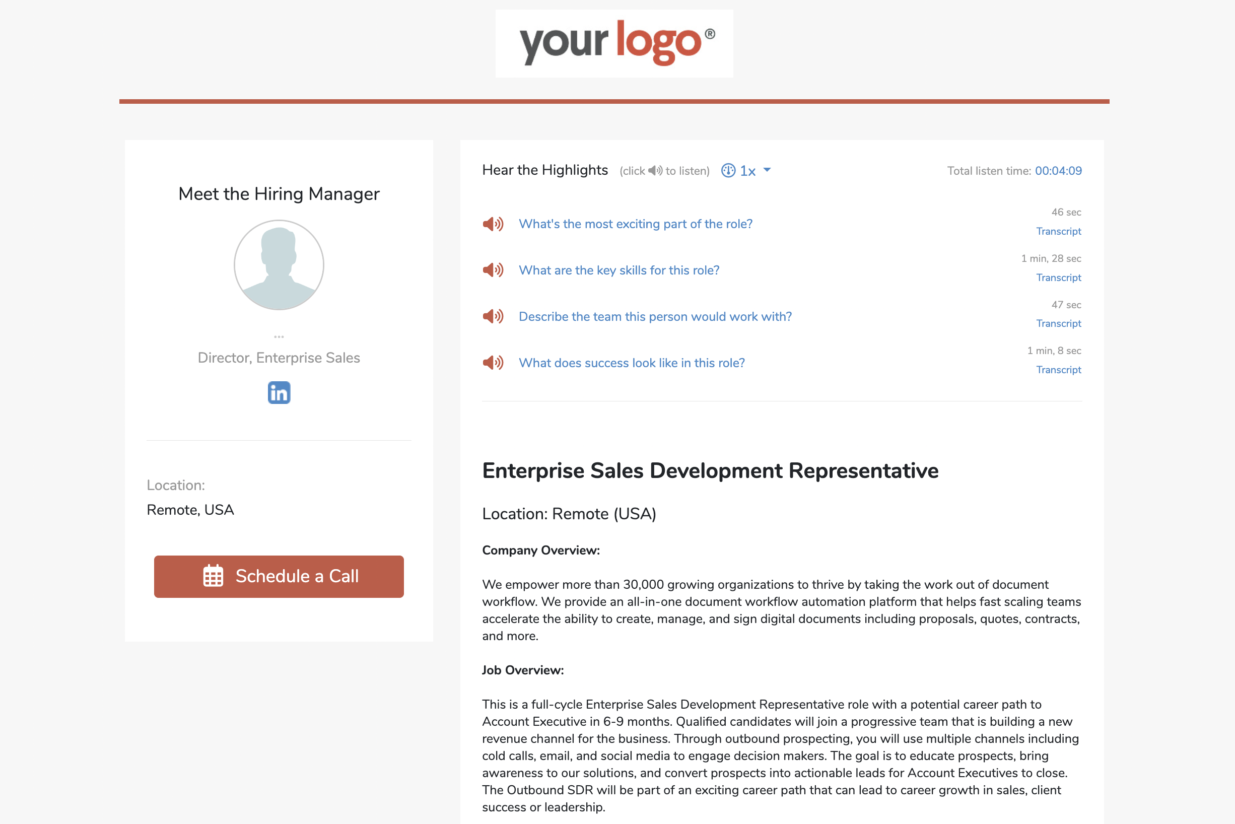 Turn your intake calls into audible job previews to attract passive candidates, showcase diverse hiring managers and increase response rates.