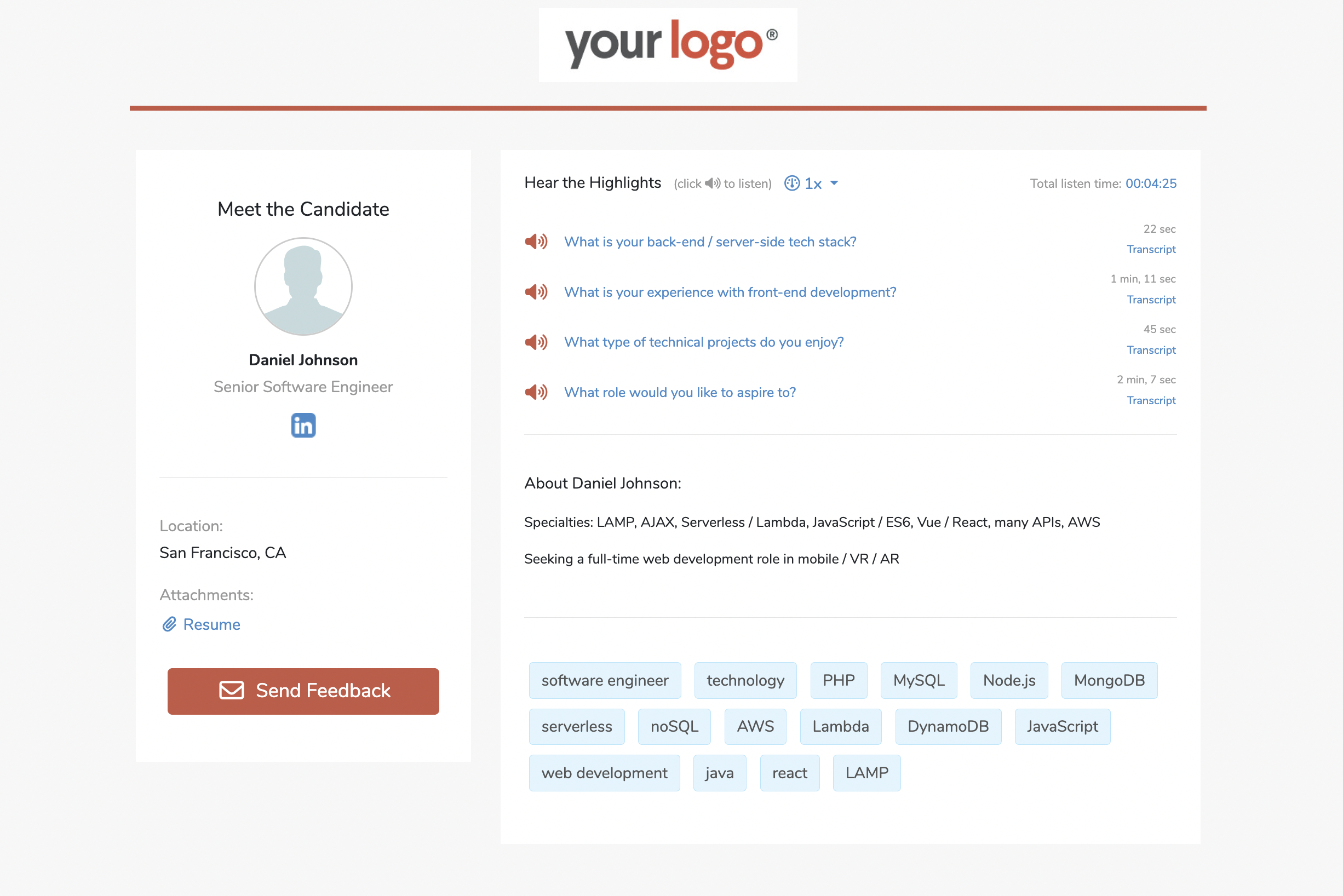 Share the key moments from intake calls, phone screens, and video calls for instant consensus.
