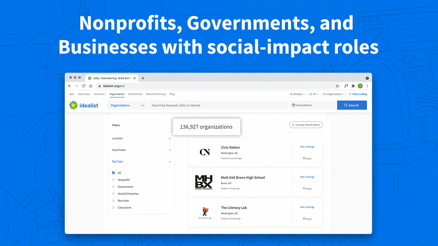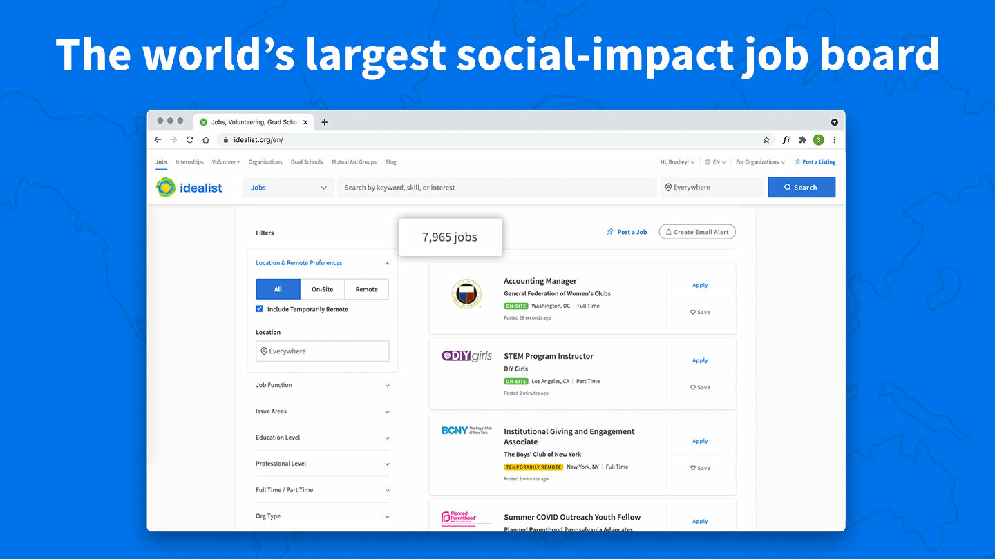 The Idealist job board is a trusted partner to our community of more than 150,000 social-impact organizations—nonprofits, government agencies, social enterprises, and other mission-driven businesses—in sourcing the best talent.