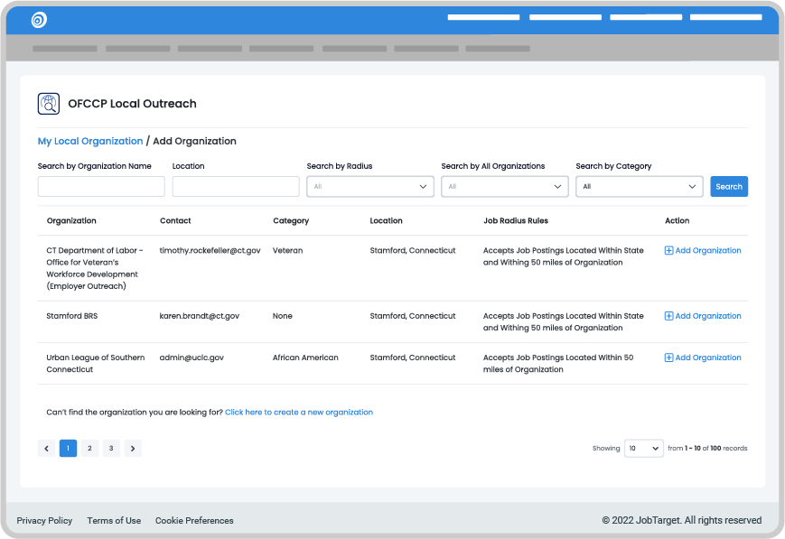 JobTarget’s Compliance solution offers multiple tools that work together to offer well rounded coverage, ensuring compliance with all recruitment related OFCCP requirements. With Compliance, you can automate posting your jobs to state job banks, easily connect with your community-based organizations, keep track of your good-faith efforts effortlessly, and supplement your diversity hiring strategy by posting to 40+ demographically distinct sites.