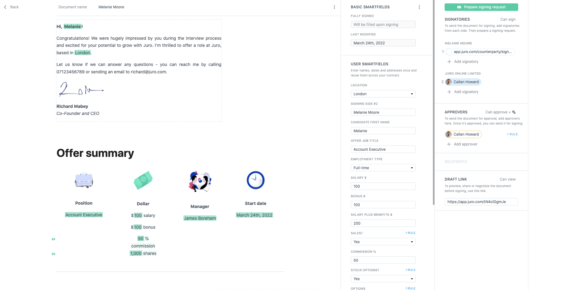 Deliver an outstanding candidate experience and streamline HR processes with Juro's collaborative contract management platform integrated with Greenhouse. Offer dynamic, responsive offer letters and employment contracts, shorten your time-to-hire, and improve the onboarding flow for new employees.