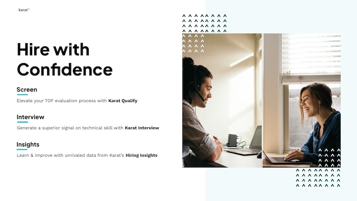 As the world’s largest technical interviewing company, Karat supercharges your hiring process with innovative assessments, expert-led technical interviews, best-in-class candidate features, unrivaled hiring data, and a predictive, trustworthy signal that empowers you to hire with confidence.