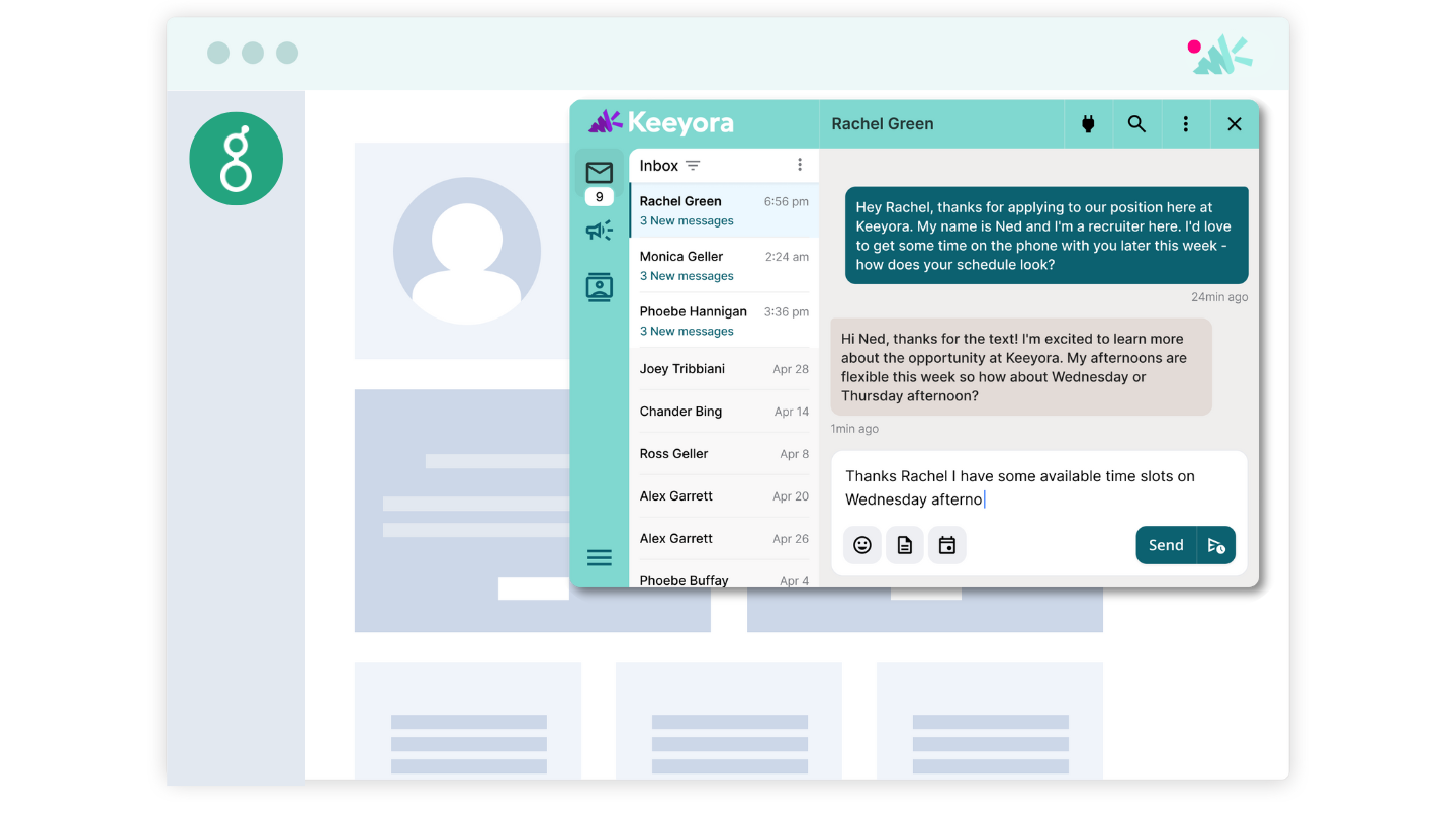 Keeyora is simple, powerful texting software for recruiting teams, HR professionals, and hiring managers. It integrates with Greenhouse to make texting with candidates easier, faster, safer, and compliant for everyone involved in the hiring lifecycle.