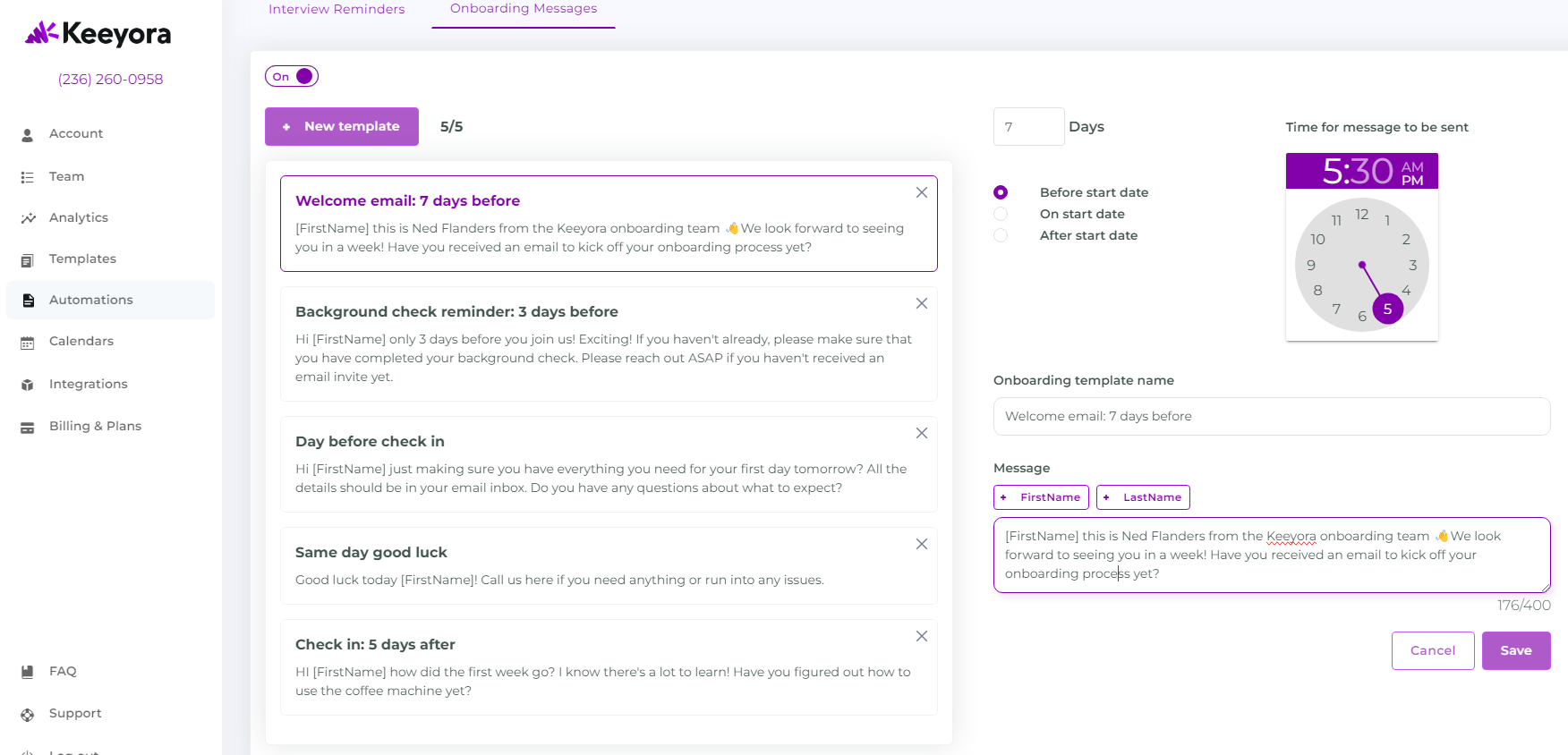 Create time-saving message templates to quickly insert into your texts, ensuring a consistent and engaging experience for every new hire.