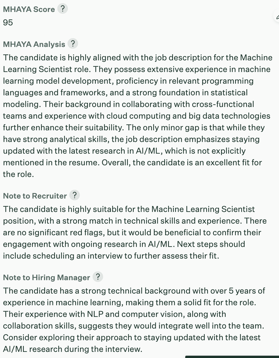 MHAYA.ai evaluates each micro-parameter by proficiency level and years of experience, ensuring top-fit candidates are identified and never overlooked.