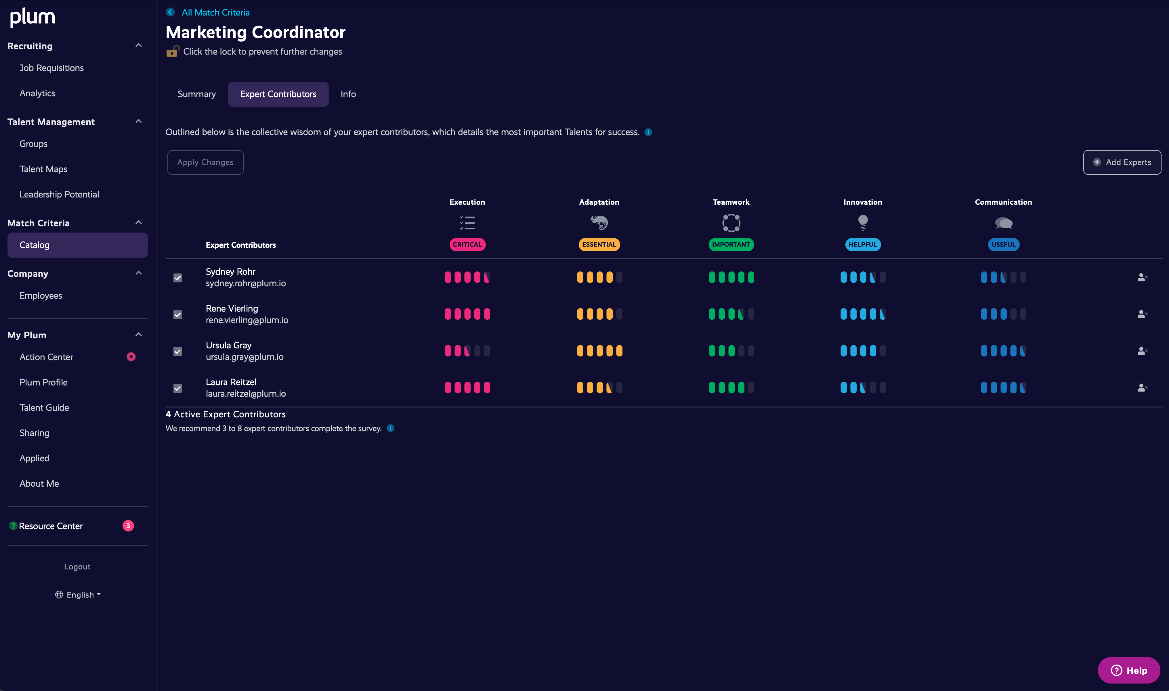 Plum is changing the scope of the talent space, and putting people at the center. Using intuitive data four times more predictive of on-the-job success than a resume, Plum is able to match human potential to job needs and enhance talent decisions across the employee journey. In a single platform, Plum provides organizations with a scalable way to complete job analysis, improve quality of hire, identify potential, create high-performing teams and more. Your people are your most important asset, and Plum gives you the resources needed to empower them and ensure they are able to reach their full potential.