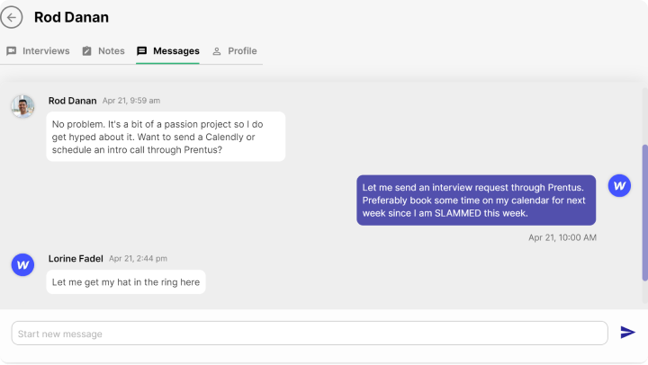 Since candidates actively track their job search and connect with their community on Prentus, they are guaranteed to respond more than 4x as often as candidates on LinkedIn. You can request interviews, automatically schedule with Google Calendar integrations, and send offers right in the platform. Ready to discover the talent you’ve been looking for?