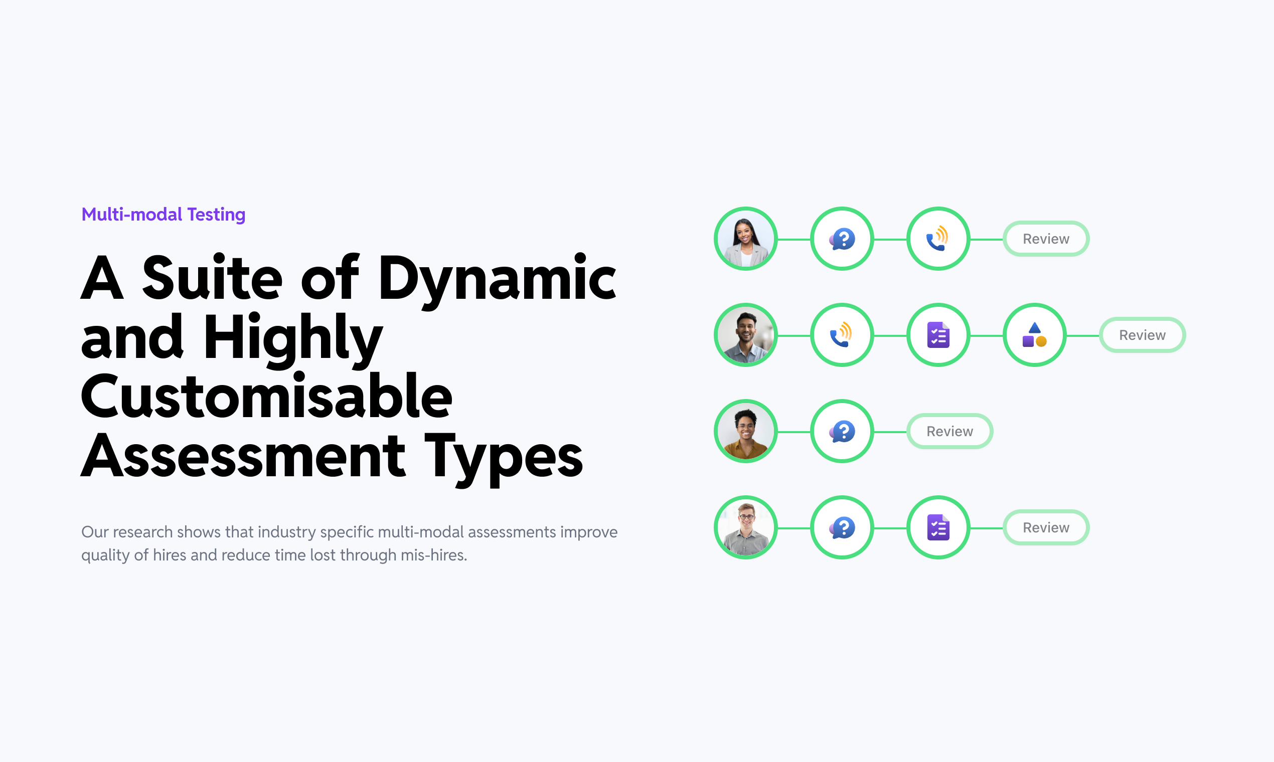 Our assessments include realistic AI interviews, voice-based mock role-plays, technical quizzes and behavioural surveys.