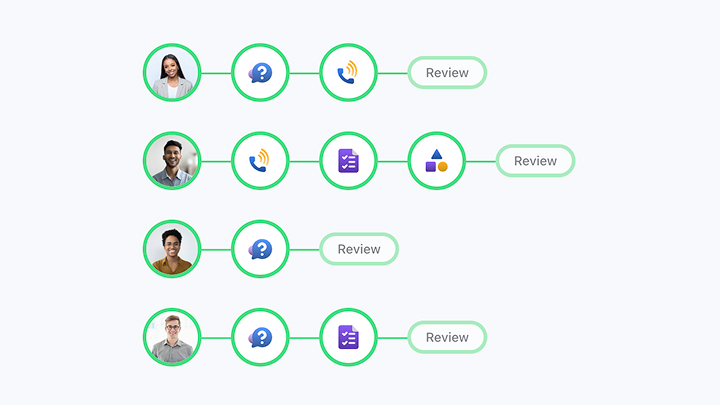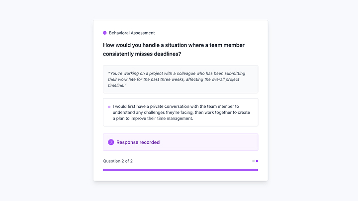 Combine voice, text, quizzes and scenario-based tasks to evaluate candidates across a range of skills in one seamless, adaptable assessment experience.