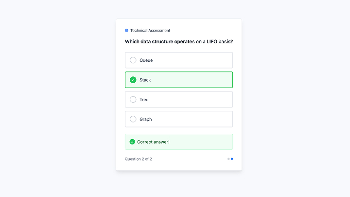Automatically scored, skill-specific quizzes to evaluate coding knowledge, problem-solving and technical ability tailored to each role.