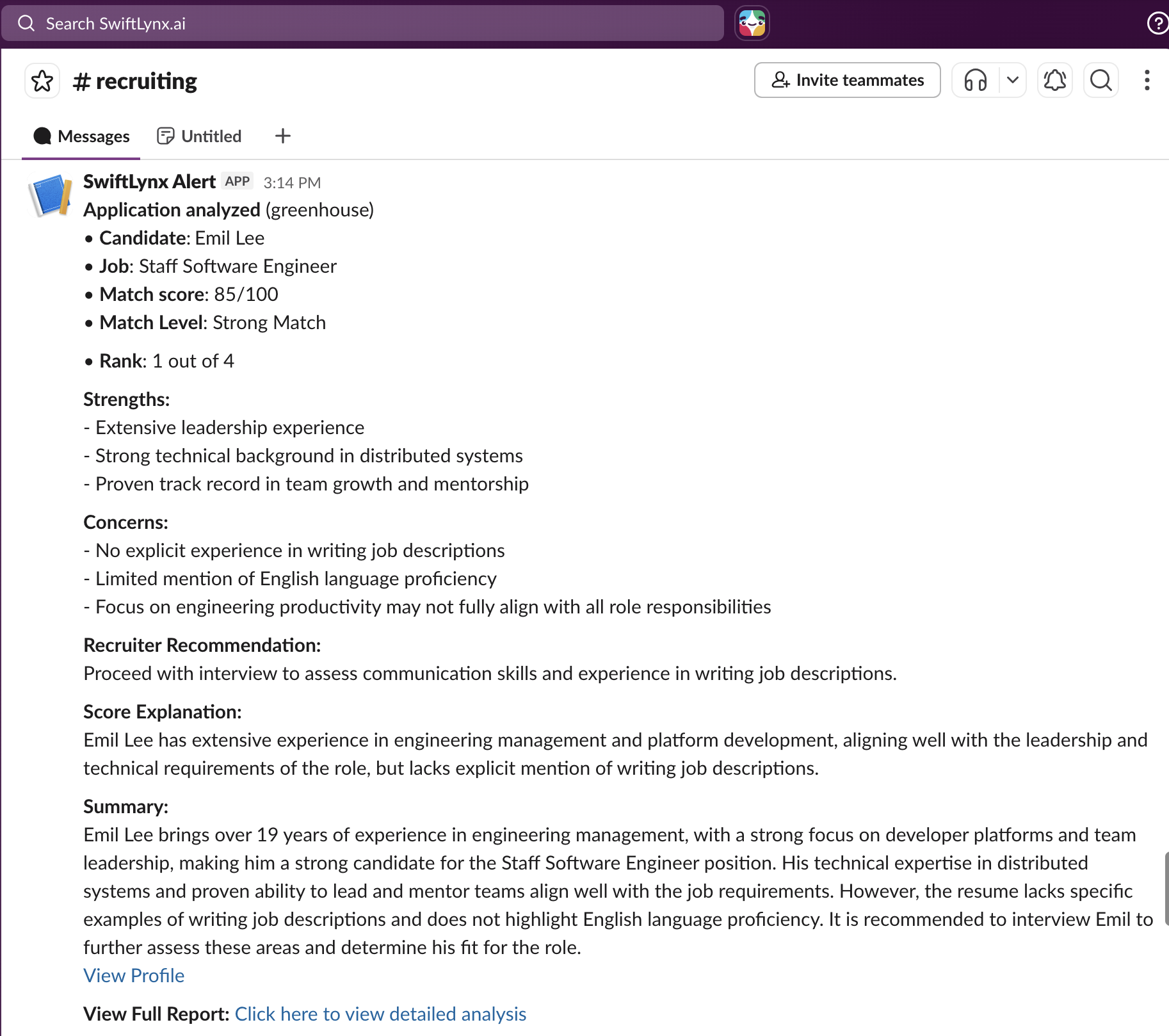 Accelerate hiring with instant Slack notifications. Recruiters can subscribe to specific jobs to receive alerts only for their own roles, ensuring top talent is never missed without the noise.