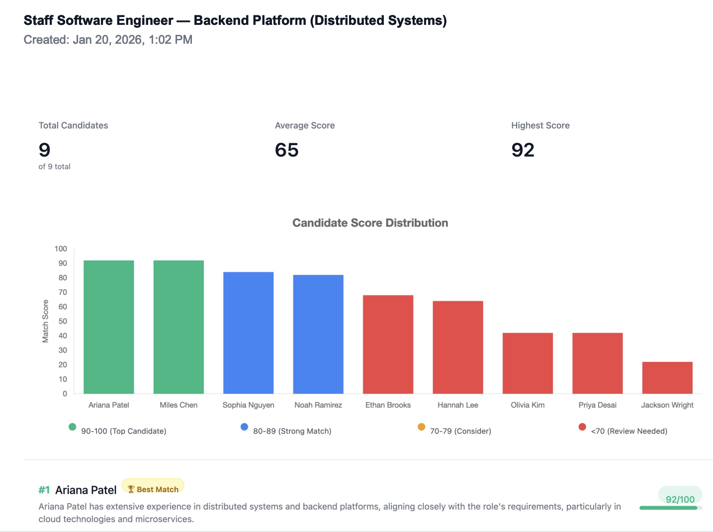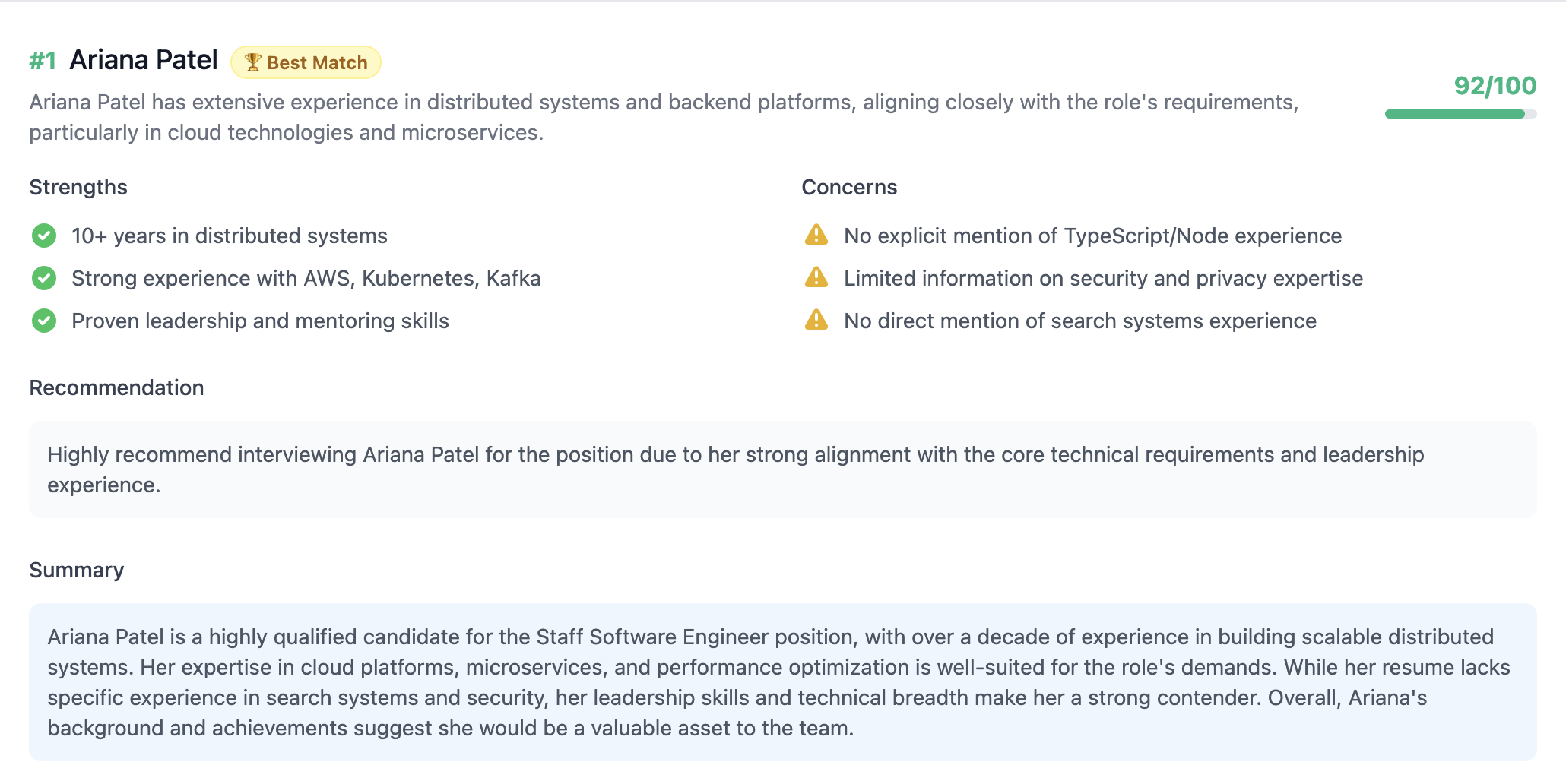 Generate clear, shareable visual breakdowns of strengths and gaps that help hiring managers identify fit at a glance and align on data-driven decisions.