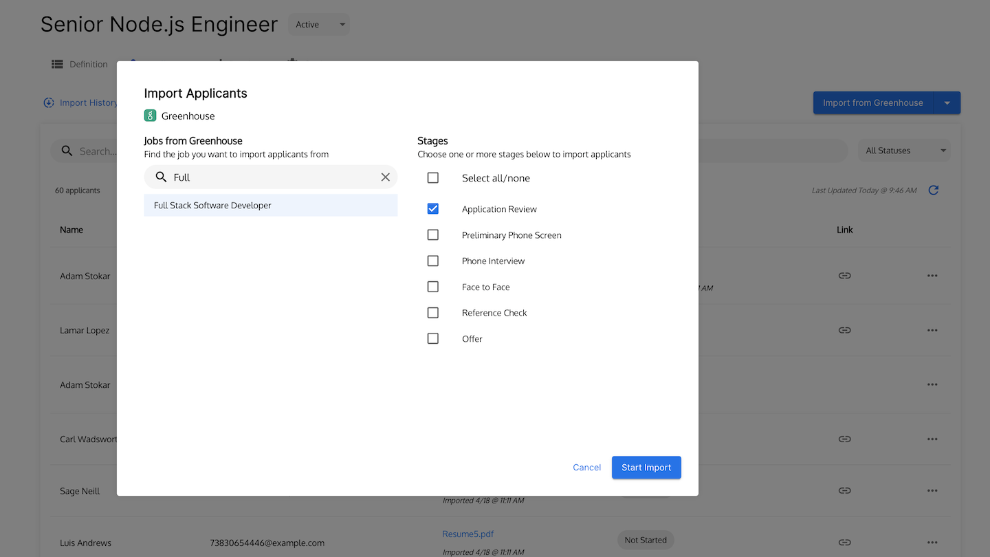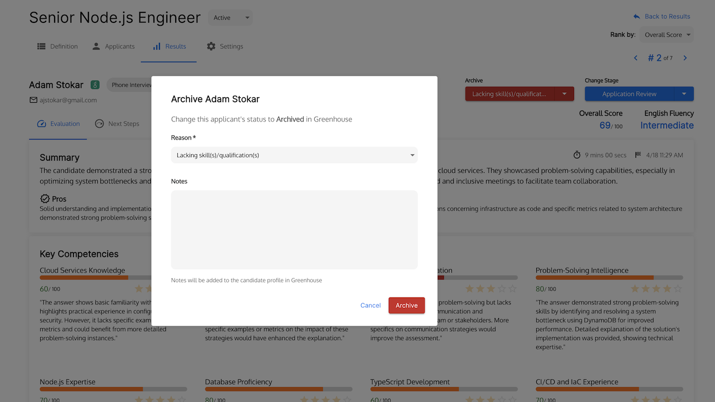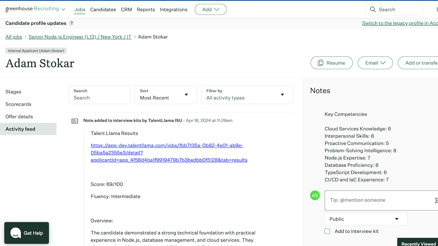 Talent Llama’s integration with Greenhouse Recruiting allows hiring teams to automatically import and invite candidates to take conversational screening interviews from any stage in the Greenhouse candidate pipeline. As screening interviews are completed, recruiters can move top candidates to the next stage or reject them directly from the Talent Llama evaluation screen.