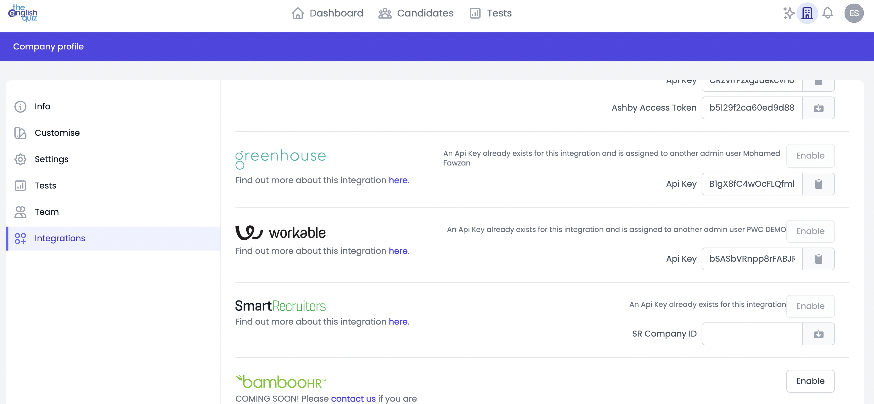 Easily enable the Greenhouse - The English Quiz integration and start testing immediately.