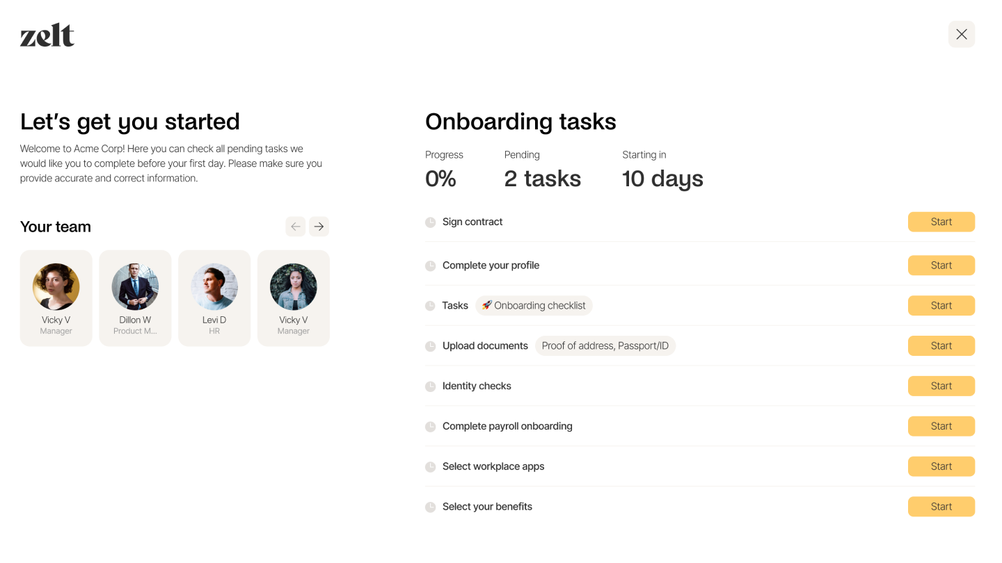 Zelt is a software application you can use to automate HR and IT tasks in your company. Now you can onboard new joiners, run payroll, manage holidays and automate IT tasks in a single system, from providing laptops to setting up accounts across your cloud applications. This saves you time and money, and is more secure.